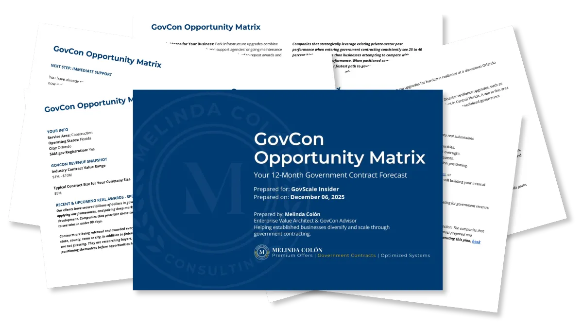 It’s a simple, clear report that shows who buys what you sell, how much they pay, what opportunities are open now, what is coming next, and how your current work can win contracts. No jargon. No NAICS codes. No guessing. Just clarity you can use right away.